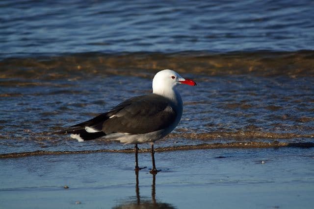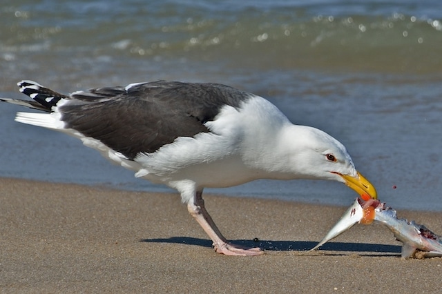 Brown pelicans are remarkable in their own right, plunging into the ocean despite their ungainly build and then surfacing, juggling fish before swallowing. At these vulnerable moments, the medium-sized but highly aggressive Heermann’s Gulls close in to seize the fish before the pelican can swallow its catch. In a curious twist, adult Heermann’s Gulls steal most frequently from adult pelicans, while juvenile gulls usually take fish from juvenile pelicans. Remarkably, over 90 percent of the Heermann’s Gull population breeds on one little island named Isla Raza in the Gulf of California. The unusually patterned, colorful gulls have a white head, dark body plumage, and prominent red bills. To further distinguish the life history of this pirate, Heermann’s Gulls practice a curious reverse migration, traveling northwards all the way from southern California to Vancouver Island, Canada.