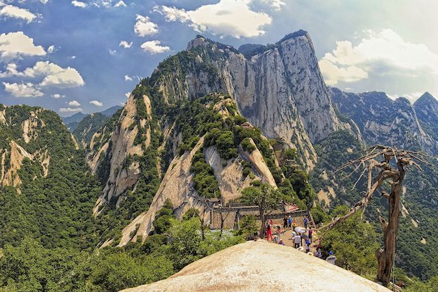 The 7,067-foot Mount Huashan, Shaanxi Province, offers a heart-stopping and unusual hike consisting of boardwalk sections strapped to the sides of the rising peaks and secured to each other with giant “staples.” A potentially dangerous “geotourism” site, the mountain rises dramatically above the surrounding foothills and farmlands. Stunning panoramic perspectives and firsthand views of sheer drops of unimaginable heights can be seen from the shockingly precarious chain hold and rickety wooden plank pathway called the “Plank Road” on the South peak of the mountain, which is known as “The Monarch of Huashan.” The plank road appears awkwardly rigged to the sides of the mountain and sometimes tilted towards it on an angle. At the end of the plank road, the “path” transforms to mere foot pegs jutting out of the mountain and footholds carved into the rock.